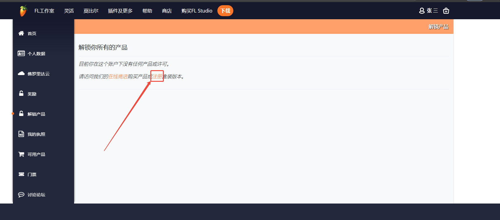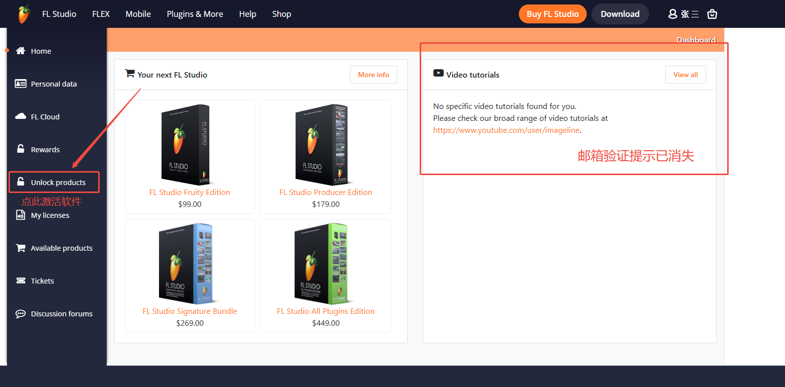 紧接着回到账户后台,我们刷新页面会发现右上角的邮箱验证提示已消失,此时我们前往解锁软件,点击左侧的Unlock products(解锁产品)进入注册解锁页面