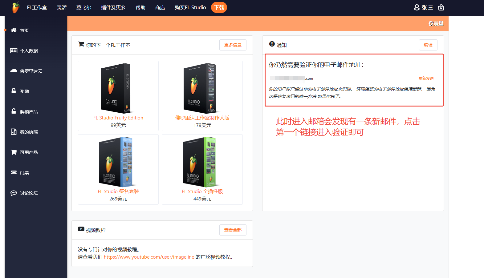 随后我们进入到软件账户后台,这里会提示你的电子邮件需要验证,此时我们需要打开我们刚刚注册账号的邮箱,找到image line刚刚发送的验证邮件。